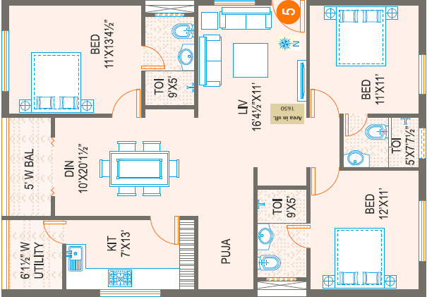 Floor Plan 5 is a 3 bed & 3 bath 1650 sq. ft. east facing spacious floor plan with great room – living + dinning, large master bedroom